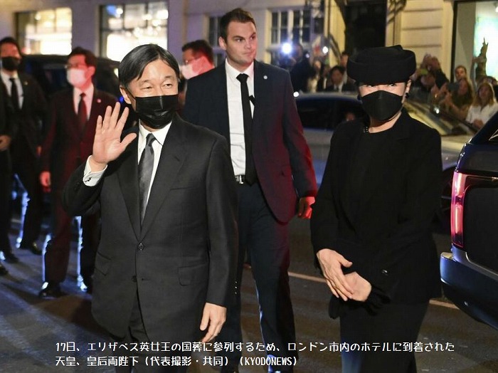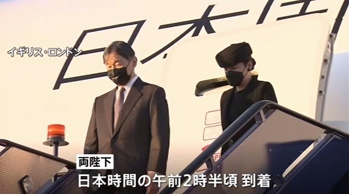 天皇皇后両陛下は日本時間の午前2時半頃、ロンドンに到着されました。日本出発時とかわって、皇后さまは黒いワンピースに黒いジャケット黒い帽子姿で、両陛下とも黒いマスクをつけられていました、宿泊先のロンドン市内のホテルに到着した際には、集まった人たちから声をかけられ、それに応えるように手を振られていました。