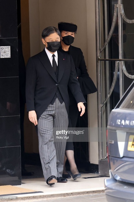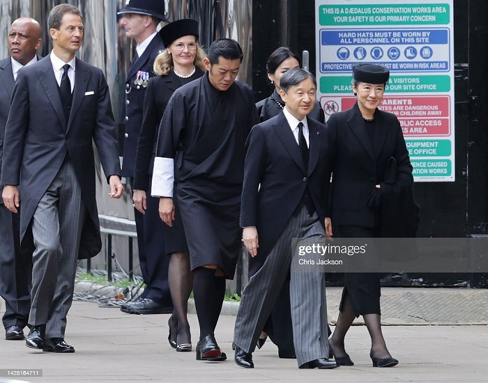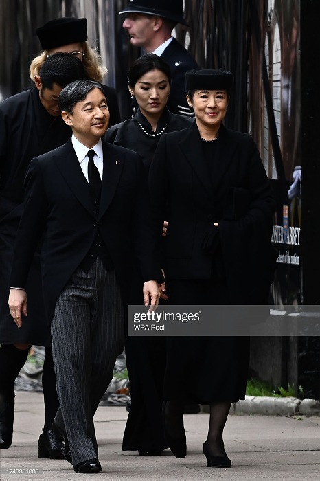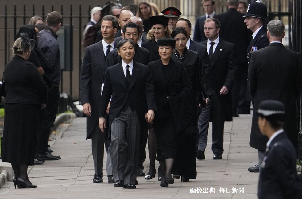 午前9時45分すぎ、黒のモーニングに身を包んだ天皇陛下と、黒のドレスに帽子姿の皇后さまは、滞在先のホテルを出発。周囲に集まった人たちの呼び掛けに軽く手を振り、車に乗り込んだ。チェルシー王立病院で英側が用意したバスに乗り換え、他の王族ら参列者と共にウェストミンスター寺院へ。両陛下は沈痛な面持ちで国葬に臨み、参列者全員で黙とうをささげ、女王の死を悼んだ。時事通信https://www.jiji.com/jc/article?k=2022091900183&g=ryl