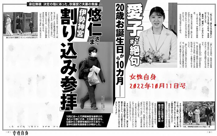 今回の悪意ある週刊誌の書きぶりですが、一つの理由は上記のようなもので、もう一つの理由は「愛子様、伊勢へ早くお出ましを!」とせかしてもいると思います。というか伊勢じゃなくてもいいから、とにかく姿を見せてください、ですね。提灯記事を書こうにもご本人が天の岩戸状態なのではどうしようもありません。お見送りに出てはこられたのですから、お元気ではあるんでしょう。でも大学に行かない、公務もしない。これでは週刊誌としても書きようがない。とにかく何でもいいから動いてくれ!