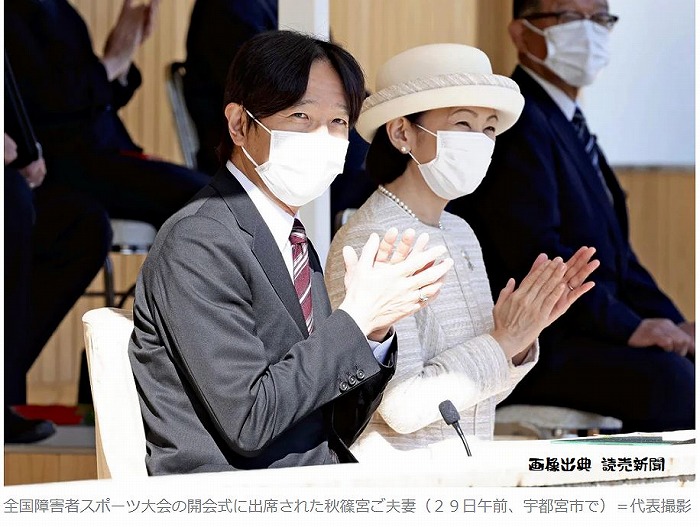 秋篠宮ご夫妻は全国障害者スポーツ大会開会式に出席のため、28日に栃木県宇都宮市に入られました。28日はいちごを栽培する施設を見学、特別支援学校での介護の授業、障害者スポーツ大会に出場する競技者を激励されました。本日は開会式後は水泳の競技を観戦されます。