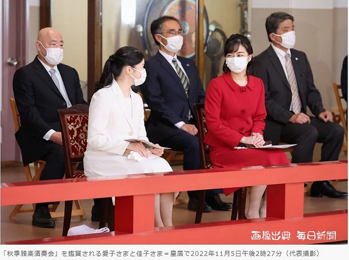 宮内庁によると、学習院大学文学部3年の愛子さまは昨年、大学の選択科目で日本の伝統芸能について学び、雅楽に関心を持ったことから、今回の演奏会の鑑賞を希望されたという。