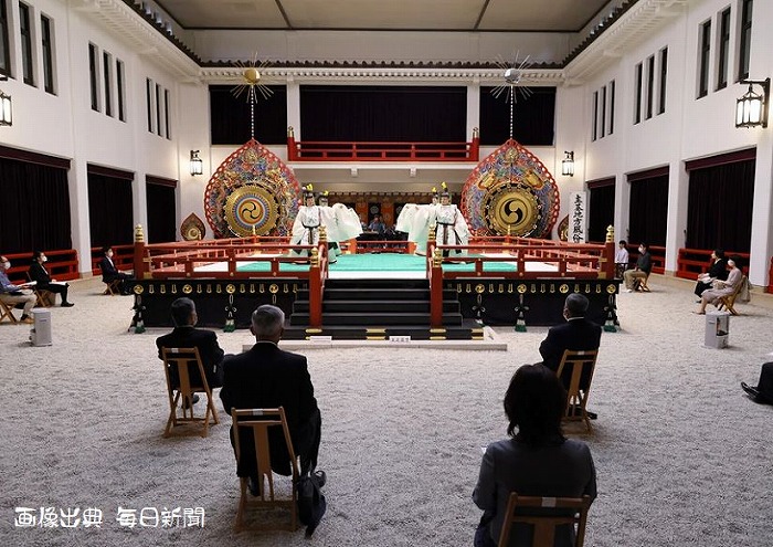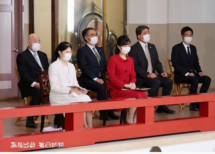 愛子さまと佳子さまは並んで座り、装束をまとった舞人(まいにん)が演奏に合わせて優雅に舞を披露すると、拍手を送られた。説明に当たった担当者によると、お二方は演奏に使う太鼓や舞の所作などについてご質問。愛子さまは太鼓の響きに「重厚な音ですね」と述べられていたという。