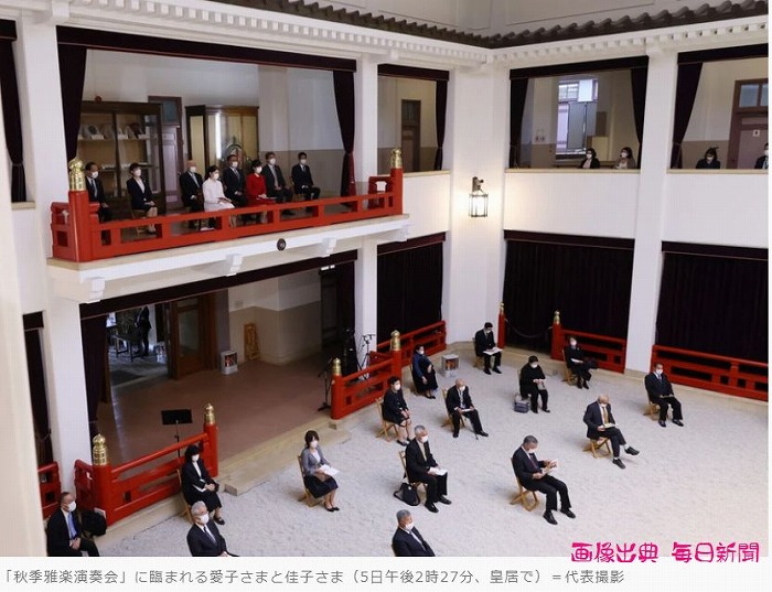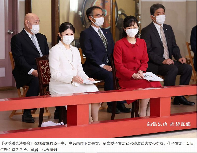 天皇、皇后両陛下の長女、敬宮(としのみや)愛子さまと秋篠宮ご夫妻の次女、佳子さまは5日、皇居・東御苑内の楽部庁舎を訪れ、宮内庁楽部による秋季雅楽演奏会を鑑賞された。愛子さまの同演奏会へのご臨席は初めて。