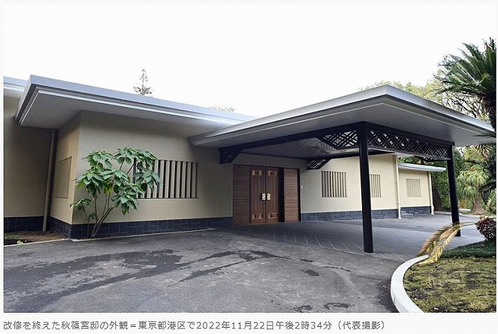 改修後の宮邸は、鉄筋コンクリート造りの地上2階、地下1階建てで、延べ面積は約2973平方メートル。秋篠宮さまが皇嗣となり職員数が増えたことを受け、事務スペースが増築された。配水管などの老朽化が進み、20年3月から改修工事をしていた。所要経費は計約30億2000万円。御仮寓所は今後、主に事務スペースとして、ご一家を支える職員が使用する。