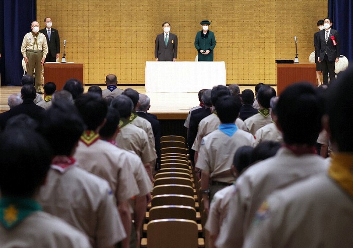 天皇、皇后両陛下は26日、東京都渋谷区で開かれたボーイスカウト日本連盟創立100周年記念式典に出席された。式典で天皇陛下は「100年の長きにわたり、青少年の健全な育成に取り組んでこられたことに、深く敬意を表します」とあいさつ。自らもキャンプや富士登山に参加し、「スカウト活動の楽しさを体験でき、得難い経験となりました」と述べた。式典には、岸田文雄首相や同連盟の御手洗冨士夫総裁らも出席した。