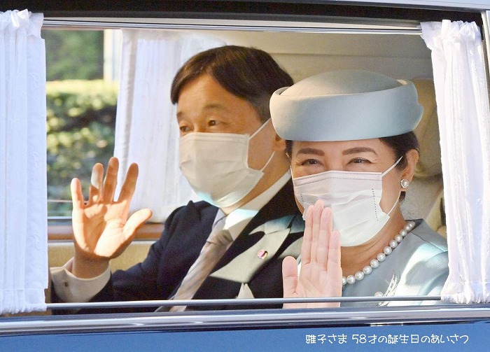 皇后さまは59歳の誕生日を迎えた9日、皇居・宮殿で祝賀行事に臨まれた。午後には天皇陛下とともに、上皇ご夫妻へのあいさつのため、赤坂御用地にある仙洞(せんとう)御所(東京都港区)を訪問された。天皇、皇后両陛下は赤坂御用地に入る際、車の窓を開け、沿道の人ににこやかに手を振って応じられた。御用地には40分ほど滞在された。