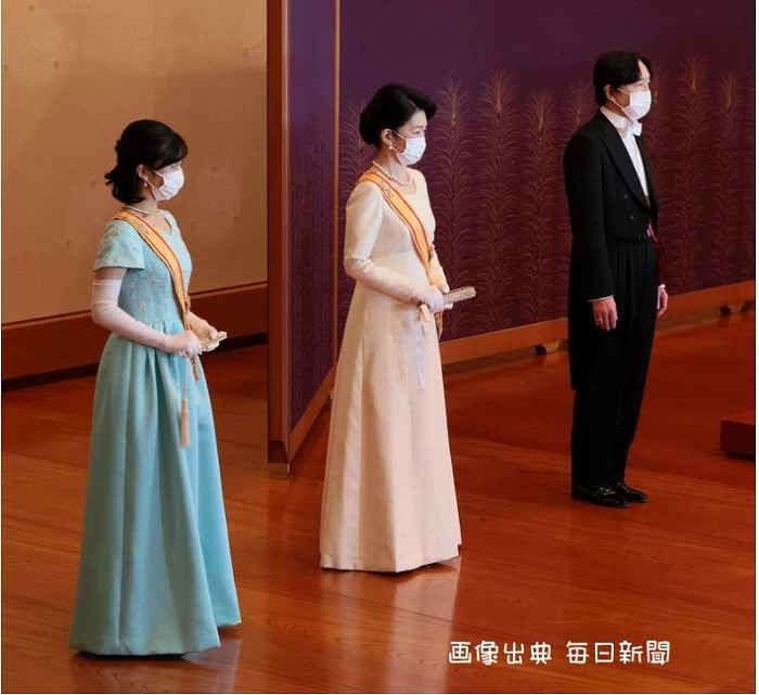 ティアラ無し、マスク着用、いつまで続けるのでしょうか。紀子さまのヘアスタイル、アップにしています。随分とスリムに見える紀子さまですが、実際お痩せになられたのでしょうか。天皇皇后両陛下と愛子さまはふくよかな体型ですね。