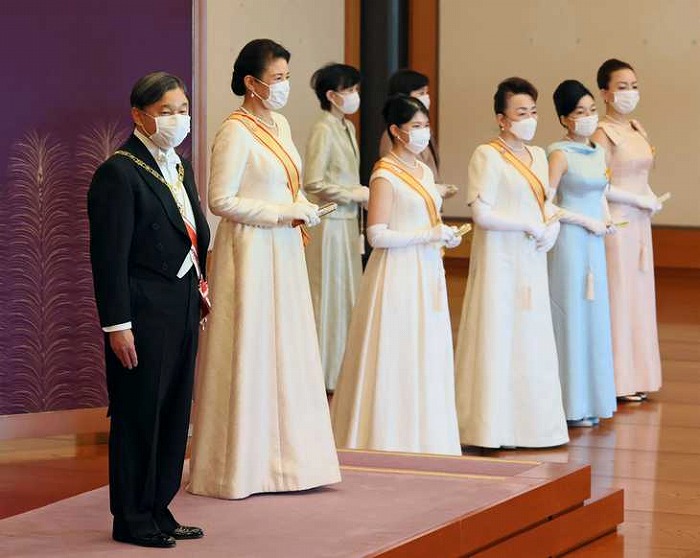 天皇、皇后両陛下が皇族方や三権の長らから新年のお祝いを受けられる「新年祝賀の儀」が1日、皇居・宮殿で行われた。新型コロナウイルス禍に配慮する両陛下のお気持ちから、女性皇族方は3年連続でティアラの着用を控えられた。