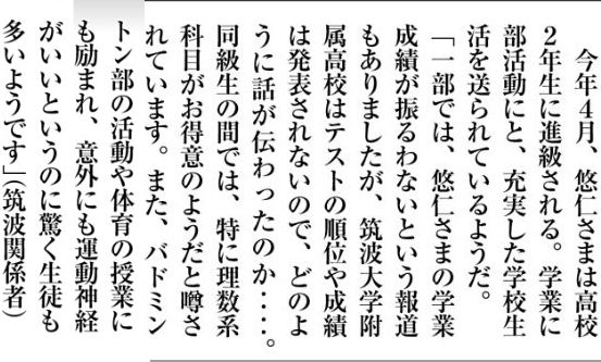 悠仁様に対して運動能力が高い、理数系の成績が良いという、秋篠宮御一家応援チームにとっては嬉しい週刊誌報道ですが、これまたよく読むと、確たる根拠は何もないんですよね。バトミントン部に入っているから運動能力がいいとは確言できないし、筑附は成績を表に出さないということで赤点問題が一件落着したはず。どちらにしても週刊誌的物の言いようだなと思うばかりです。