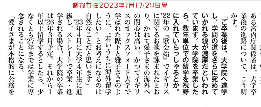 週刊女性は早くも愛子さまの本格的公務は2027年と書いています(笑)学習院大学卒業後は大学院に進み、数年単位での留学も視野に入れている。2027年までは学業に専念されることになるので、そのしわ寄せが佳子さまに・・。大学院に2年、海外留学に2年、学びたい事があるので~もしかしたら海外留学5年とか??