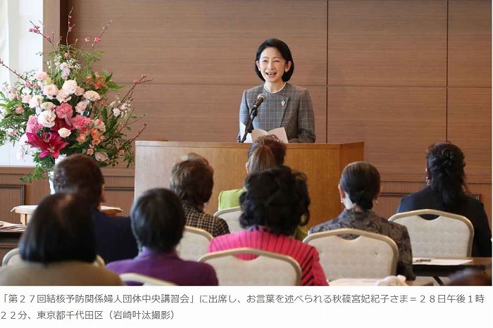 秋篠宮妃紀子さまは28日、東京都千代田区のホテルを訪れ、「第27回結核予防関係婦人団体中央講習会」の開講式に臨席された。講習会は紀子さまが総裁を務められている結核予防会などが主催している。紀子さまは開講式でのお言葉で、講習会が新型コロナウイルス禍の影響で3年ぶりに対面で開催されたことに触れ、「感染症対策をされながら、できることを工夫して積極的に活動されてきた皆さまの熱意と行動力に、深く敬意を表します」とねぎらわれた。記事・画像出典 産経新聞 https://www.sankei.com/article/20230228-5FDJYSQBWZL5JFJL6DDT5RN3V4/