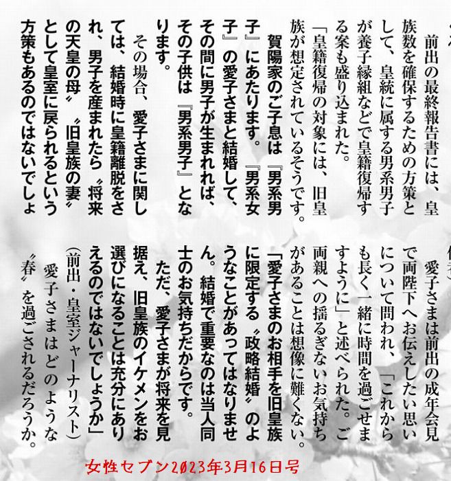 何とか愛子さまを皇室に残そうと、妄想記事も出ていますね。