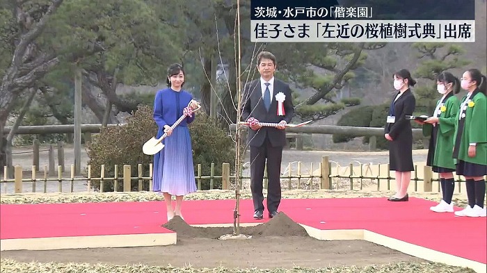 秋篠宮家の次女佳子さまは16日、水戸市を訪れ、2019年の台風15号で倒れた偕楽園のヤマザクラ「左近の桜」の植樹式典に出席された。偕楽園の左近の桜は約200年前、仁孝天皇から水戸藩に贈られた京都御所の左近の桜の苗木を、藩校の弘道館に植えたのが始まりとされる。1963年に茨城県が宮内庁から苗木の提供を受け、偕楽園に植樹。台風で倒木後の21年3月、県が再び宮内庁から苗木の提供を受け、育てていた。