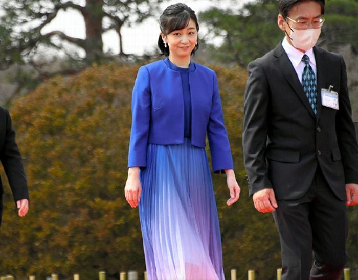 今回の佳子さまのお召し物、白から青へのグラデーションのプリーツスカートが綺麗、ショート丈のジャケットのセットとのバランスも良いですねぇ。 そして佳子さま式典に合わせてイヤリングは桜でした。私的に佳子さまはロングヘアーの時より今のセミロングの方が似合うと思います。 眞子さんの公務も良かったのですが、佳子さまは眞子さんを上回った公務をされるようになりました。