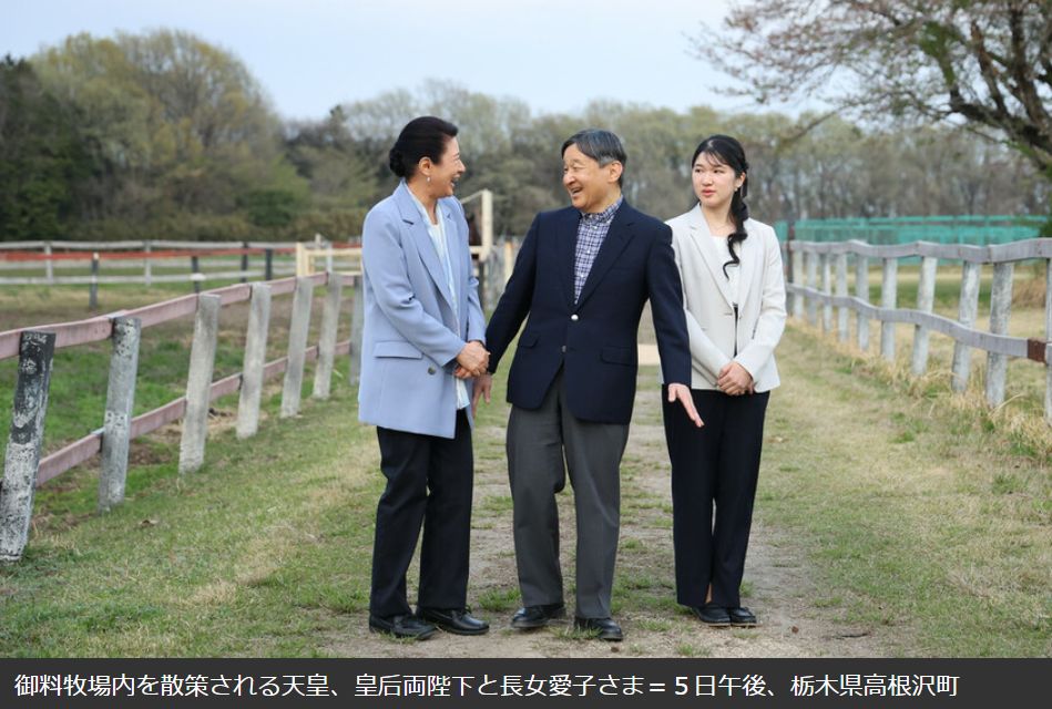 5日午後、天皇皇后両陛下と愛子さまは、お住まいの御所を車で出発し、静養のため栃木県にある御料牧場に到着されました。ご一家は馬の放牧地を散策されましたが、その最中、馬を見ようとして両陛下の頭がぶつかり、お互いがほほ笑まれる場面もありました。