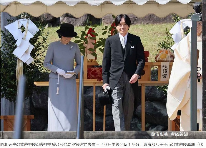 秋篠宮ご夫妻は5月の英国訪問を前に20日、武蔵陵墓地(東京都八王子市)を訪れ、昭和天皇陵「武蔵野陵」と香淳皇后陵「武蔵野東陵」を参拝された。