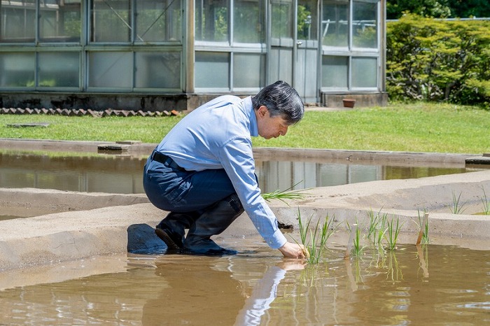 天皇陛下は16日、皇居内の生物学研究所脇の水田で、恒例の田植えをされた。陛下は水色の長袖シャツに紺のズボン、黒の長靴姿。水田に入ってしゃがみ、自身が4月に種もみをまいて栽培したうるち米のニホンマサリともち米のマンゲツモチの苗計20株を丁寧に植えた。皇居の稲作は昭和天皇が始め、上皇さま、陛下へと引き継がれた。秋に稲刈りをし、収穫した米は宮中祭祀(さいし)の新嘗祭などに使われる。記事出典 時事通信 https://www.jiji.com/jc/article?k=2023051600591&g=ryl