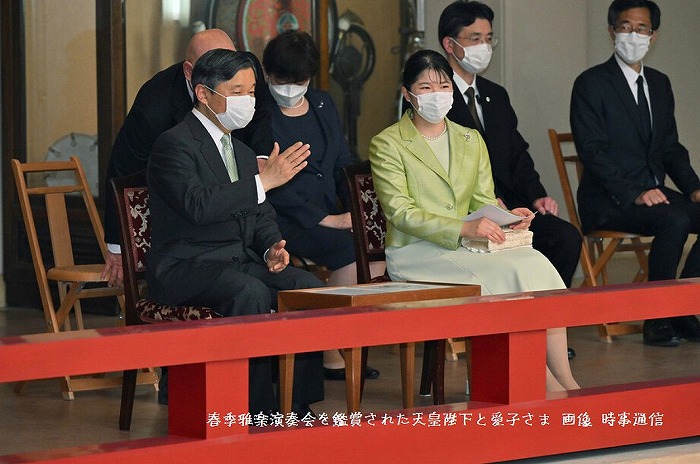 天皇陛下と長女愛子さまは28日午後、皇居の宮内庁楽部で開かれた春季雅楽演奏会を鑑賞された。
