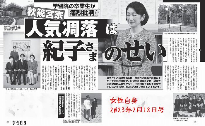 「女性自身が秋篠宮家人気凋落は紀子さまのせい」このように単刀直入なタイトルで記事を書いています。
