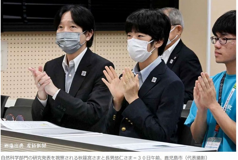鹿児島県を訪問中の秋篠宮さまと長男悠仁さまは30日、鹿児島市で全国高校総合文化祭の会場を巡り、自然科学部門や美術・工芸部門を視察された。鹿児島大では、カブトムシの種を分ける生息地域の境界線など、生物をテーマにした研究成果の発表があり、秋篠宮さまと悠仁さまは手元の資料を見ながら熱心に耳を傾けた。終了後、悠仁さまは「面白かったです」と生徒に話しかけ、自身もトンボに興味があることを明かしたという。また、曽於市の県立曽於高に足を運び、実習農場を視察した