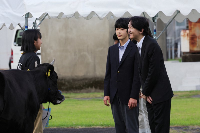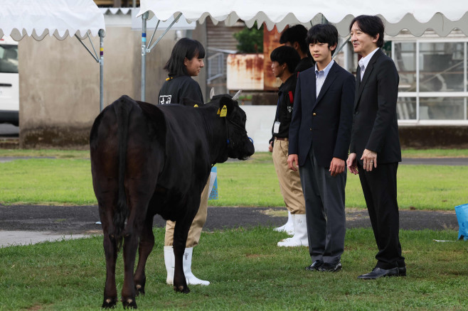 。畜産同好会の生徒が牛を運動させる様子を見学し、秋篠宮さまと悠仁さまは牛に餌を与えた。