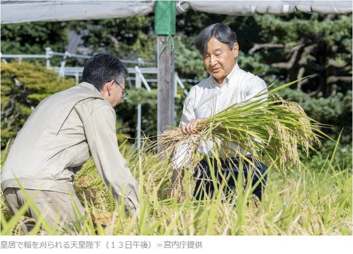 天皇陛下は13日、皇居内の生物学研究所脇にある水田で、稲刈りをされた。長袖シャツにズボン、長靴姿の陛下は、鎌を手にしゃがみ込み、5月に田植えをしたもち米の「マンゲツモチ」と、うるち米の「ニホンマサリ」計20株を、力強く刈り取られた。皇居での稲作は昭和天皇が始めた恒例行事。収穫された稲の一部は伊勢神宮(三重県伊勢市)に奉納されるほか、宮中祭祀(さいし)にも使われるという。記事・画像出典 産経新聞
