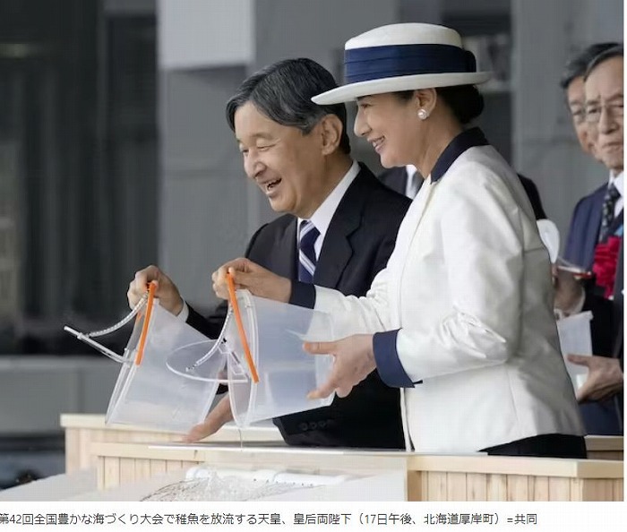 天皇、皇后両陛下は17日、北海道厚岸町の厚岸漁港を訪問し、第42回全国豊かな海づくり大会の式典に出席された。天皇陛下は式典で、2021年に北海道の太平洋沿岸で発生した赤潮による漁業被害に触れ、「今日まで関係者が連携し、漁場の回復に向けた取り組みが進められていることに、心から敬意を表します」と述べられた。両陛下はその後、地元の漁船約10隻の歓迎を受け、北海道の名産で知られるマツカワの稚魚とホッカイエビを海に放流された。同日夜、特別機で帰京された。