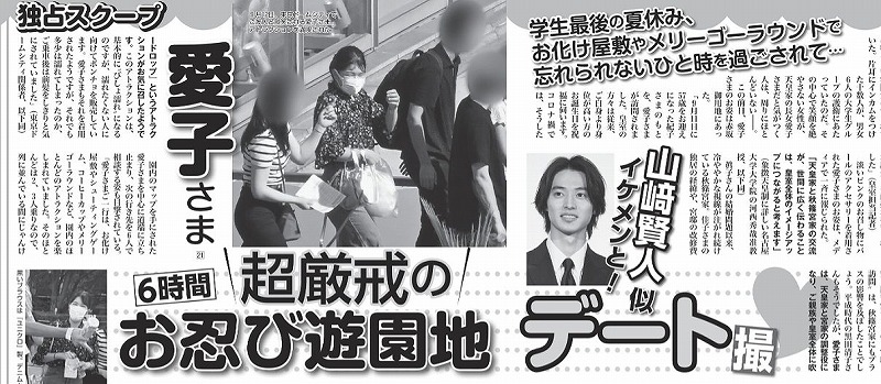 愛子さまの楽しい写真が週刊女性に載っていました。週刊女性の紙面タイトルは「愛子さま 超厳戒のお忍び遊園地デート」学生最後の夏休み、お化け屋敷やメリーゴーランドで忘れられないひと時を過ごされて」