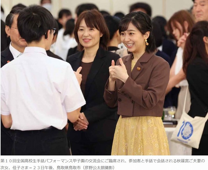佳子さまは、地元の小学生が自分で名前を彫った給食の茶碗(ちゃわん)を見学し、説明役の5~6年生の児童3人に「このお茶碗で食べるご飯はおいしいですか」と話しかけられた。地元陶芸家がろくろで土から皿の形に作り上げる実演も見て回られた。その後、鳥取市のホテルで手話パフォーマンス甲子園関係者の交流会に臨席し、高校生らと懇談された。24日は鳥取市で開会式に臨み、生徒たちの演技を観覧される。記事出典 産経新聞https://www.sankei.com/article/20230923-NE4OMTNJKVPLVOXYXORBGOP3XI/