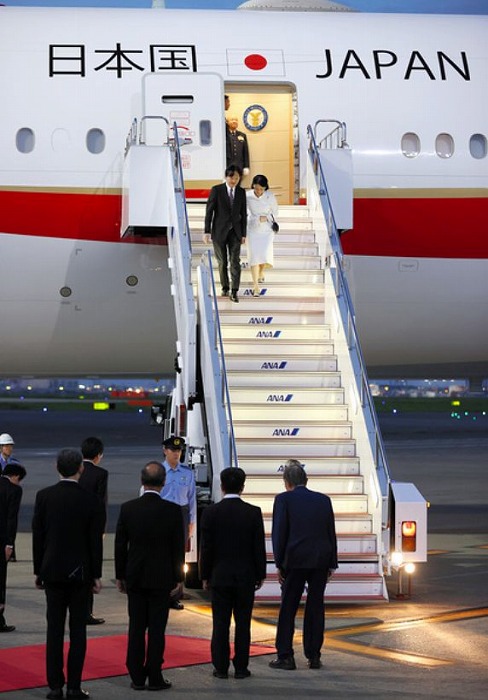 強く降りしきる雨の中、ご夫妻は政府専用機に搭乗した。