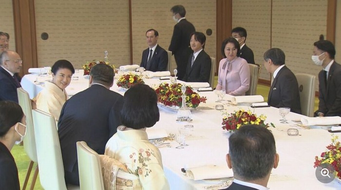 昼食会は随員を合わせて出席者を14人に絞り、席の間隔をあけるなど感染対策を講じた。宮内庁によると、外国の賓客を招いた昼食会では主に西洋料理が提供されるが、両陛下のご提案で初めて和食の前菜が出された。記事出典 産経新聞https://www.sankei.com/article/20231117-OITSD7OJMZOKNIU2G72HZVAWSA/