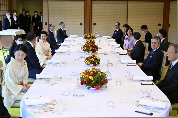 その後午餐(ごさん、昼食会)も催され、秋篠宮ご夫妻が陪席された。外国の賓客を招いての宮殿での昼食会は令和元年12月以来で、新型コロナウイルス禍後初めて。