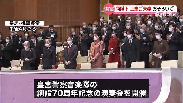 11月20日、天皇皇后夫妻、上皇夫妻、秋篠宮ご夫妻、佳子さま、三笠宮彬子さま、高円宮久子さまが皇居の桃華楽堂で行なわれた皇宮警察の音楽隊の演奏会を鑑賞されました。