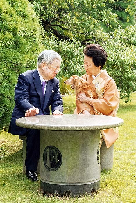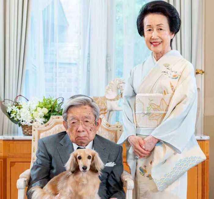 11月28日に米寿となる88歳の誕生日を迎えた常陸宮さま。愛犬の「福姫(ふくひめ)」をひざにのせ、妻の華子さまとともに、翌年のグリーティングカード用の写真撮影に応じた=2023年7月21日午後、東京都渋谷区の常陸宮邸の応接室、宮内庁提供