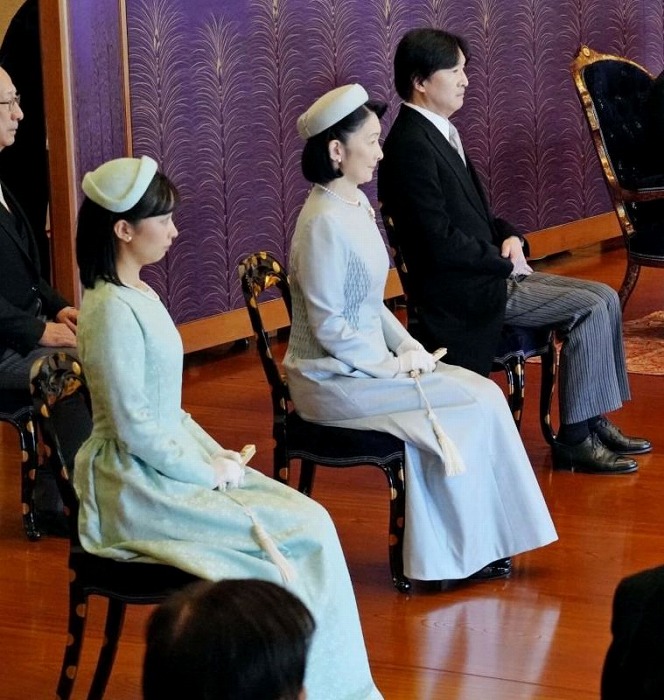 外交使節団からの挨拶は長くて結構大変そうでした。今上は年齢を感じ、立ち姿が上皇さまに似て来たなと感じました。雅子さまは終始口角を上げ挨拶されていましたが、目がきょろきょろして気になりました。愛子さまも時々笑顔をお見せでした。「新年祝賀の儀」のカメラアングルの雅子さまは、崩れたのか変なまとめ髪でしたね。