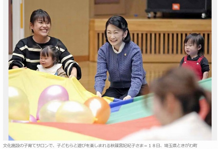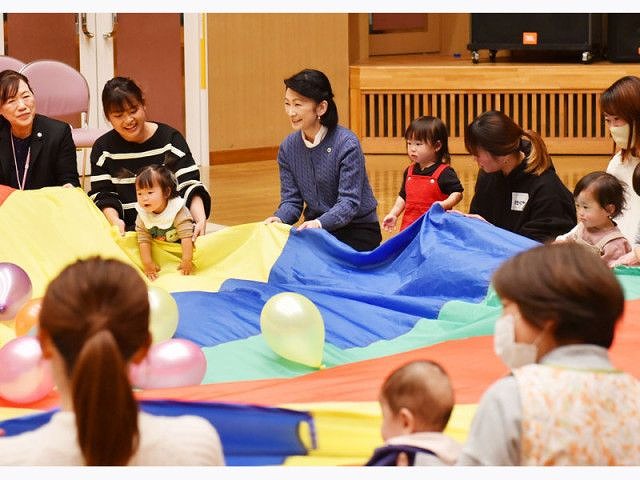 秋篠宮妃紀子さまは18日、埼玉県ときがわ町を訪れ、県内の母子愛育会の活動を視察された。この日は町の文化施設で「子育てサロン」が開かれ、紀子さまは参加した親子と一緒に、円形の布の端を持って動かす遊び「パラバルーン」を体験された。その後、子育て支援に取り組む会員から話を聞き、活動をねぎらわれた。記事出典 読売新聞https://www.yomiuri.co.jp/koushitsu/20240118-OYT1T50207/