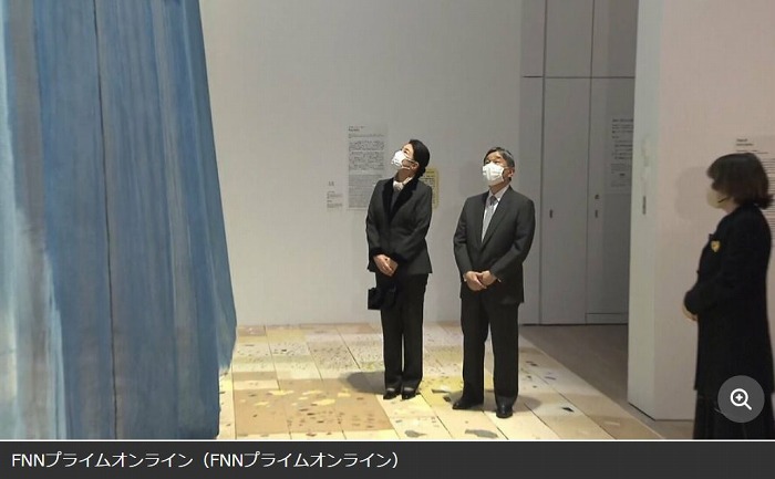 環境問題などに様々な視点で向き合った作品を見て回り、陛下は空を表現した藍染めの布を見上げて「ずいぶん大きいですね」と感心され、皇后さまは路上で拾い集めたガラスなどが埋め込まれた床に着目し、「いつ頃集められたんですか」と質問されていた。記事出典 FNNプライムオン