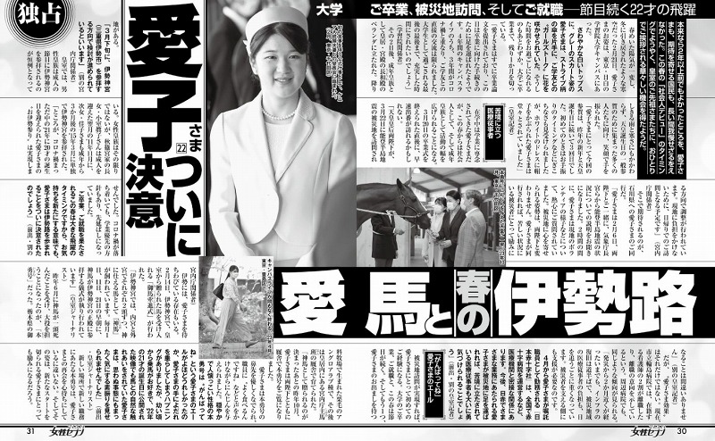 女性セブンの下のタイトルを見た時は「本当かよ~」と思ったのですが、なんと!TBSテレビと 日テレNEWSが3月に愛子さまが1人で伊勢神宮参拝するとニュースにしたので、本当に1人で参拝するでしょうね。