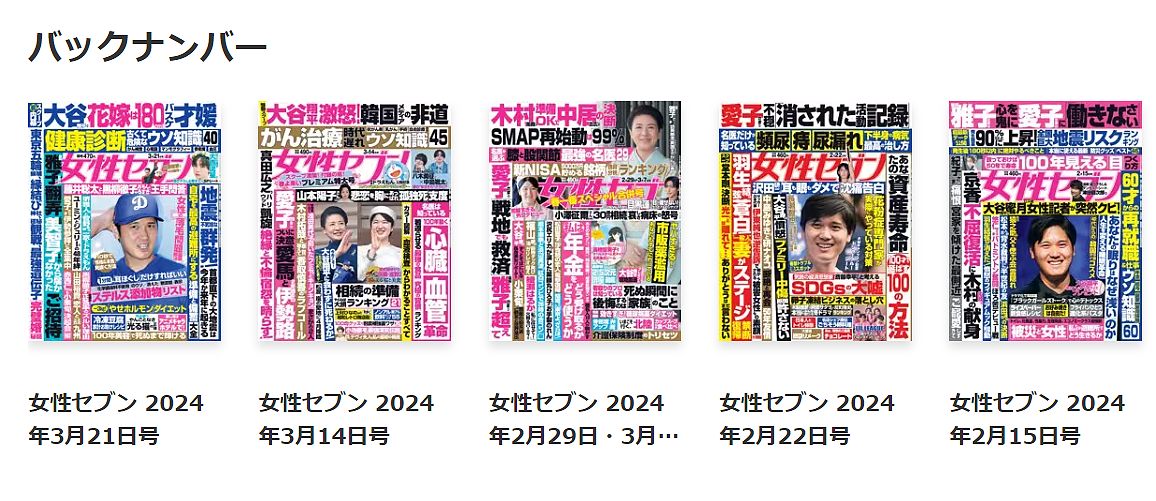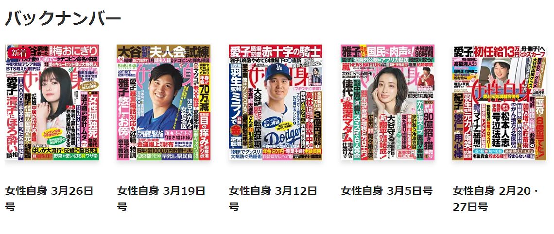 宮内庁から秋篠宮家批判ストップの指示が出たのか?分かりませんが女性自身、余程悔しかったのか、悠仁さまを悠仁さんと書いてます。愛子さまの事は愛子さまです。下の画像は女性誌のバックナンバーですが見えにくくてすみません。