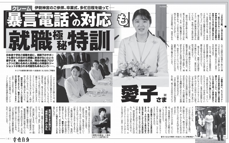 週刊女性も愛子さまメインのどーでもよい記事に悠仁さまのトンボ、韓ドラのどうでもよい事しかないです。