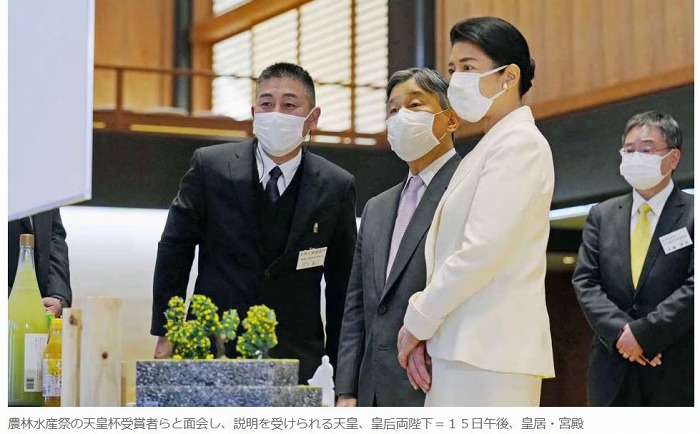 天皇、皇后両陛下は15日、皇居・宮殿で、令和5年度の農林水産祭で天皇杯を受賞した農林水産業や畜産などの関係者と面会し、展示された生産品や加工品をご覧になった。天皇陛下は冒頭、「農林水産業や地域社会の発展に貢献されたことをうれしく思います」とお言葉を述べられた。続いて皇后さまとともに、受賞者らから多様な取り組みについて聞かれた。両陛下はそれぞれの説明を熱心に聞き、おねぎらいに。富山県で地元産の水産物を用いた一夜干しなどを製造している受賞者に対しては、隣接する石川県を震源とした能登半島地震の被害を気遣う言葉をかけられた。