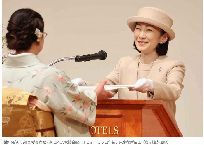 秋篠宮妃紀子さまは15日、東京都新宿区のホテルで、第75回結核予防全国大会の式典に臨席された。結核予防会の総裁を務めており、あいさつで「それぞれの専門性を活かし、協力・連携し、結核対策をさらに進めていかれますこと」を願われた。