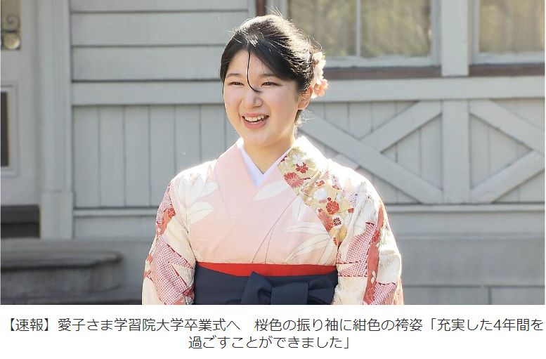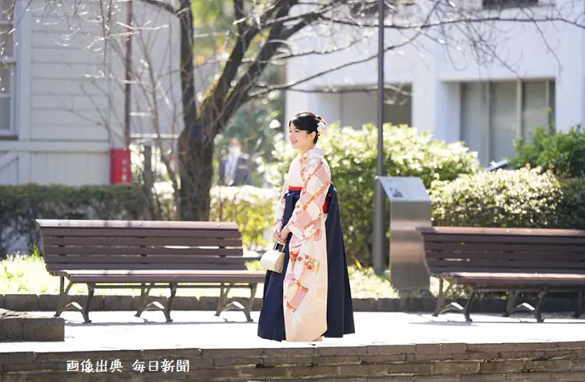 天皇皇后両陛下の長女、敬宮愛子さまは、学習院大学の卒業式を迎えられた。午前9時15分過ぎ、桜色の振り袖に紺色の袴姿の愛子さまは東京・目白の学習院大学のキャンパスに登校された。