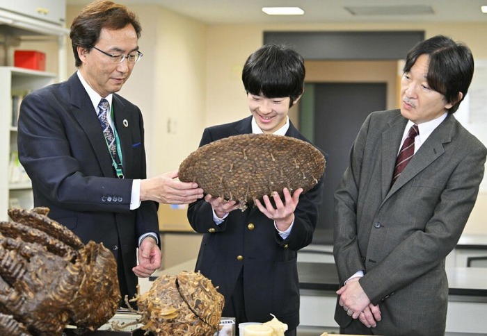 秋篠宮さまと長男悠仁さまは6日、玉川大(東京都町田市)を訪れ、農学部教授らの案内で実験室など学内を視察された。最先端の技術を用いたアワビの養殖施設では、悠仁さまは「この中に2万匹」と尋ね、取り出されたアワビをじっくりと観察した。昆虫科学実験室では、スズメバチの巣を手に持ち「何層かになっていますね」と驚いた様子。秋篠宮さまも「かなり厚いですね」と感想を述べた。