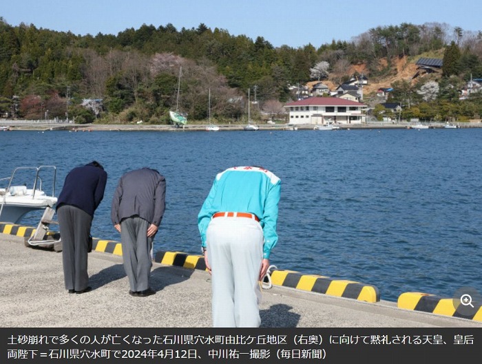 予定より数十分遅れるものの、行程通り穴水町と能登町を巡られるという。穴水町では町中心部を視察後、避難所で被災者と懇談し、災害対応に尽力した関係者もねぎらわれる。その後、能登町に移動し、避難所で被災者に声をかけた後、津波に襲われた地域を視察し、夜に帰京される。宮内庁によると、両陛下奥能登地域の被災状況に心を痛め、輪島、珠洲両市以外の地域でのお見舞いも望まれていた。訪問先は宮内庁と石川県が調整して決定したという。記事出典 読売新聞 https://www.yomiuri.co.jp/koushitsu/20240412-OYT1T50089/