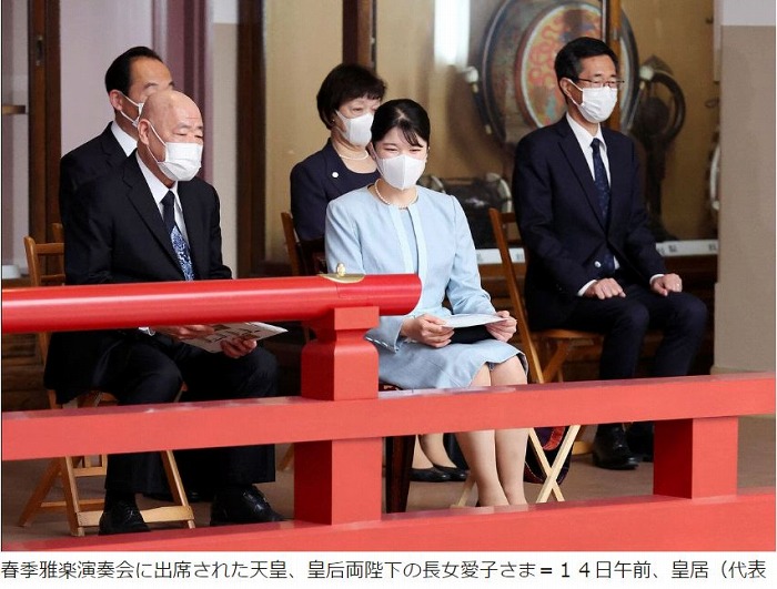 天皇、皇后両陛下の長女愛子さまは14日、皇居の宮内庁楽部で、雅楽の演奏会を鑑賞された。演奏会は毎年春と秋に行われているが、愛子さまの鑑賞は2022年秋以降4回連続で、単独では初めて。愛子さまは2階席で、担当者の説明にうなずきながら、荘厳な音色に熱心に耳を傾け、曲が終わると拍手を送った。舞楽では眼鏡を掛け、舞の所作などを確認。「とても楽しめました」と感想を述べていたという。記事出典 時事通信https://www.jiji.com/jc/article?k=2024041400370&g=ryl#goog_rewarded