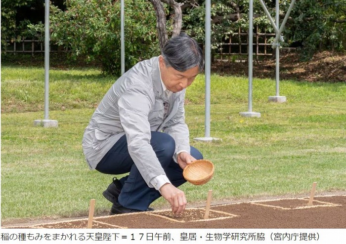 天皇陛下は17日、皇居内の生物学研究所脇にある苗代に、稲の種もみをまかれました。