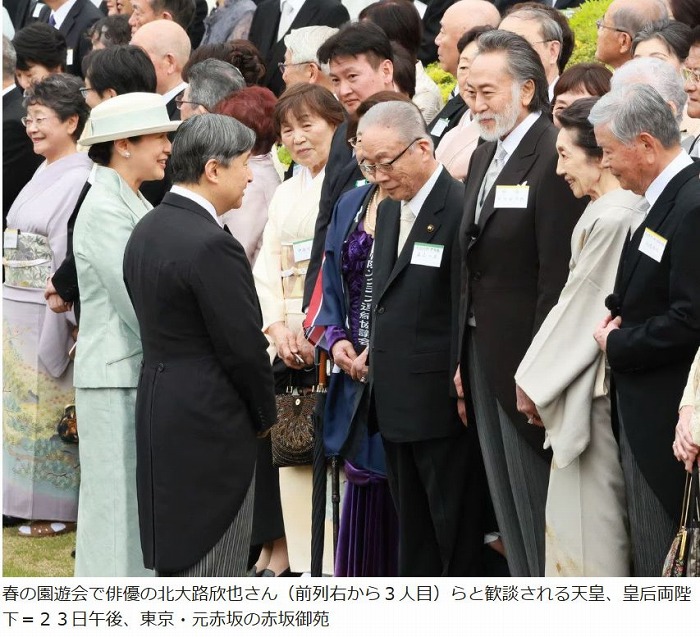 天皇、皇后両陛下主催の春の園遊会が23日午後、東京・元赤坂の赤坂御苑で開かれた。俳優の北大路欣也さんや元日本サッカー協会会長の川淵三郎さんら約1800人が招待され、両陛下や皇族方が声を掛けて回られた。今春に学習院大学を卒業した両陛下の長女愛子さまも初めて出席した。