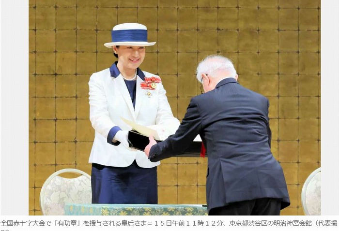 皇后さまは式典で、赤十字活動に貢献した個人と団体に贈られる「有功章」の受章者代表13人に賞状などを手渡された。今年1月の能登半島地震の被災地で炊き出しなどに取り組んだ金沢市の女子大学生や、パレスチナ自治区ガザで医療支援を行った看護師の女性らによる活動報告も行われ、皇后さまは熱心に耳を傾けられていた。