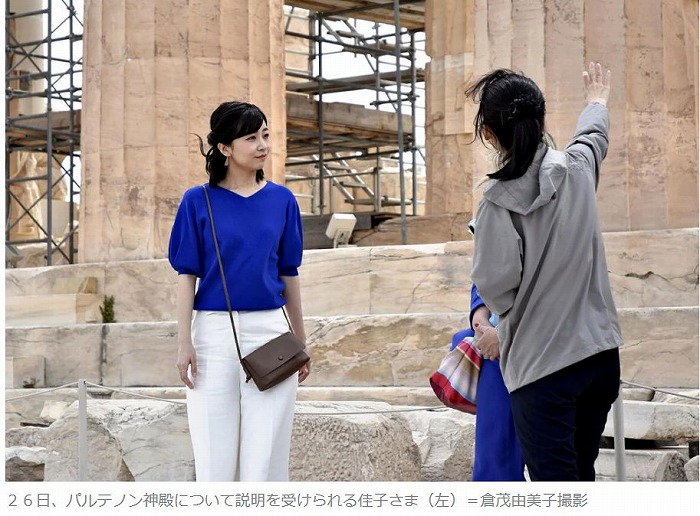 パルテノン神殿では、青と白、ギリシャの国旗と同じ色の御洋服の佳子さま。神殿に映えますね。